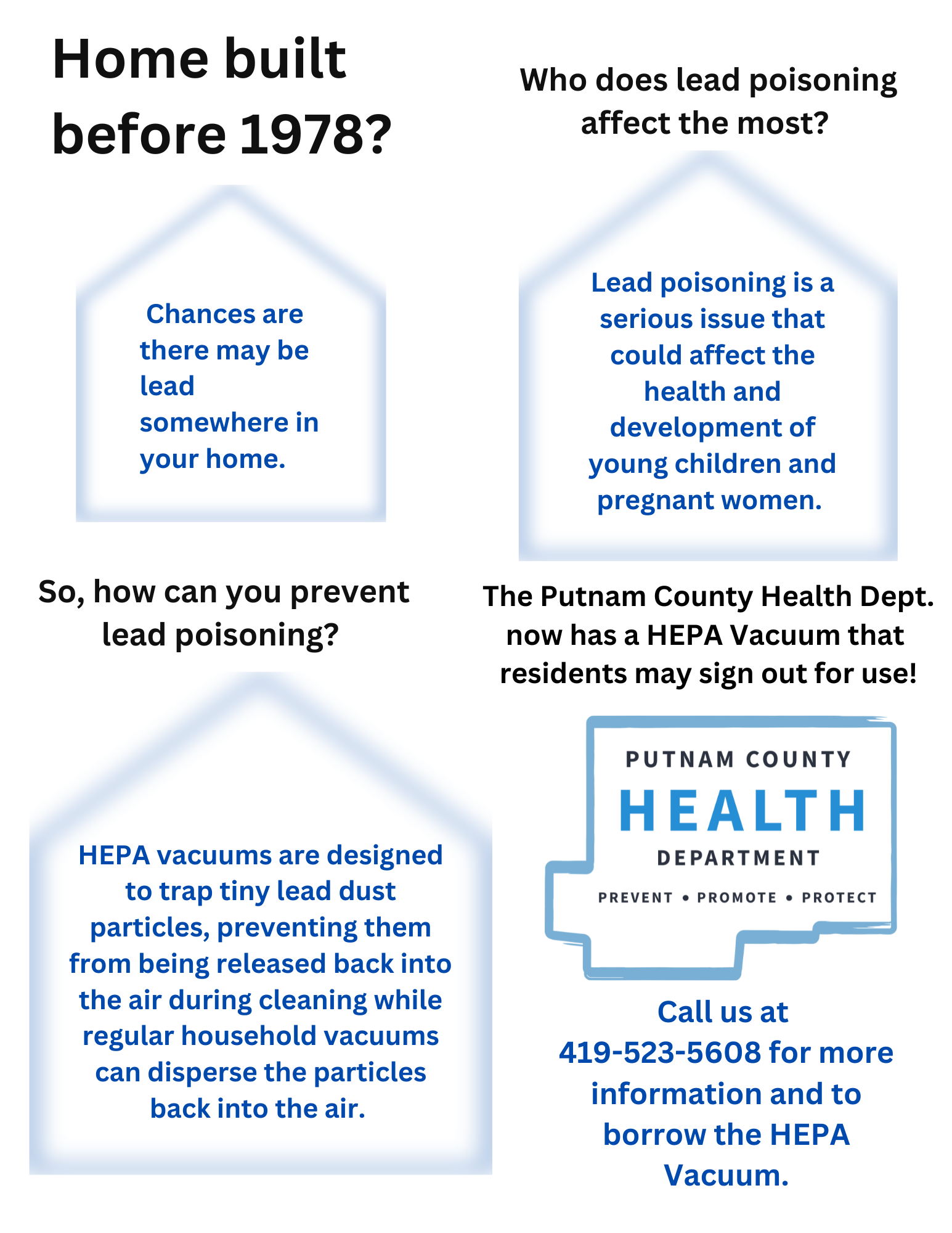 Lead poisoning is preventable with the right precautions. One of those precautions is using a HEPA vacuums. The Putnam County Health Department now has a HEPA Vacuum that Putnam County residents may sign out for use at no cost. Click the link to the right of the page or call us at 419-523-5608 to learn more.