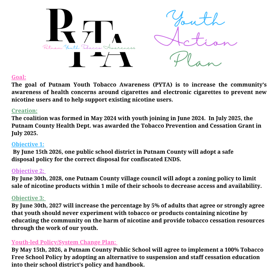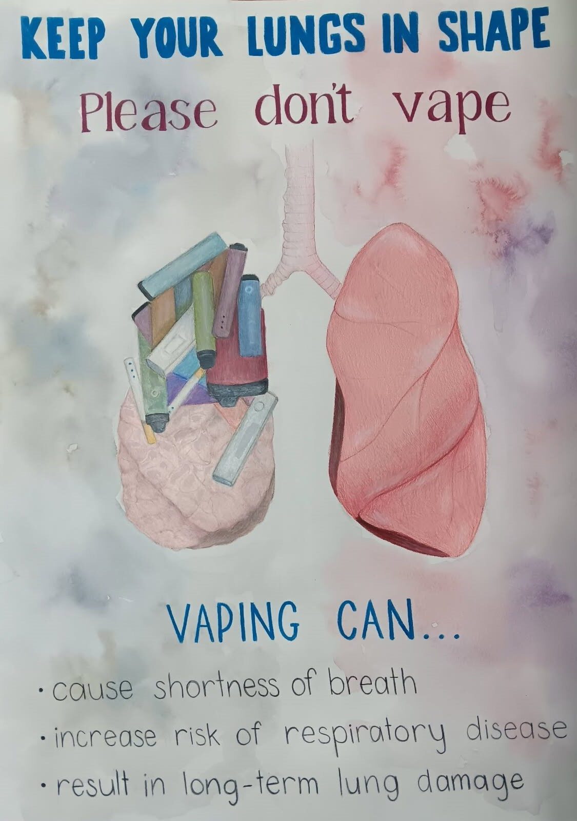 Putnam County students were challenged to create an Anti-Vaping art project. We had over 50 art submissions across the 8 Putnam County schools. We had a lot of great art! Below are the 1st, and 2nd place winners’ projects with links to the 3rd place winners’ s video.